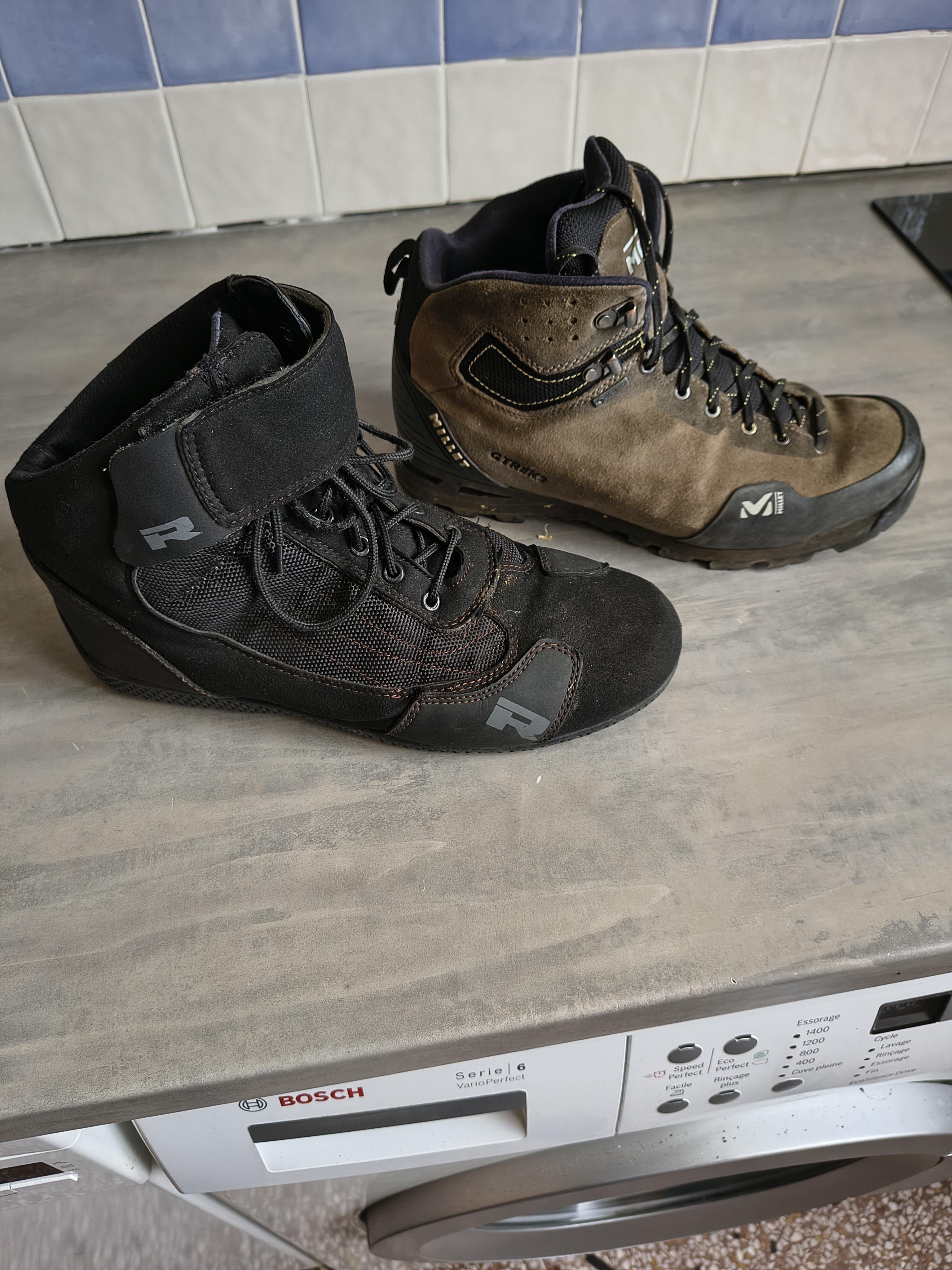 Depuis plusieurs années, j’ai des bottines spéciales moto. La marque Richa. J’avais payé ça 130 €. Elles sont confortables, légères, se laissent oublier.