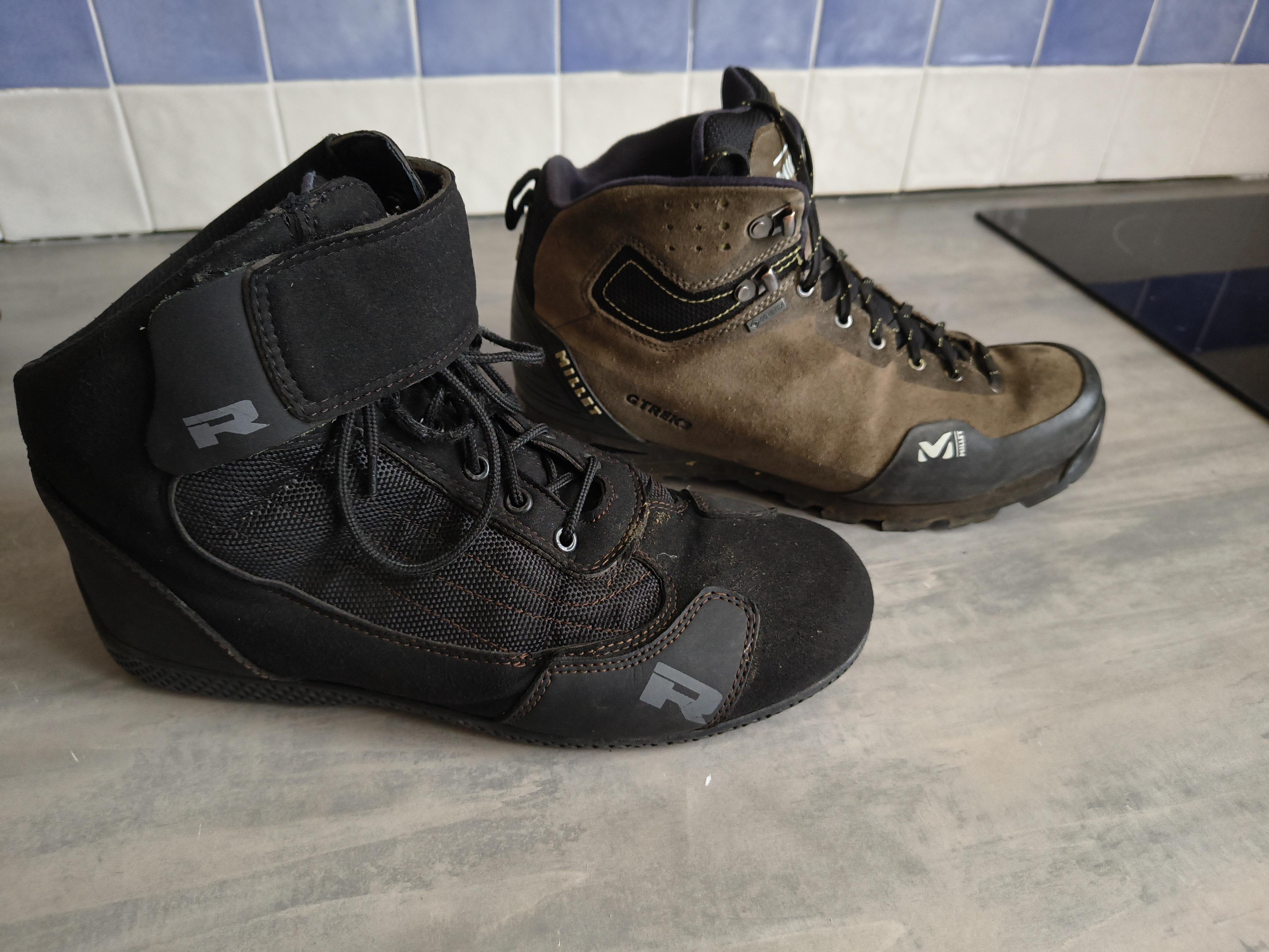 Depuis plusieurs années, j’ai des bottines spéciales moto. La marque Richa. J’avais payé ça 130 €. Elles sont confortables, légères, se laissent oublier.