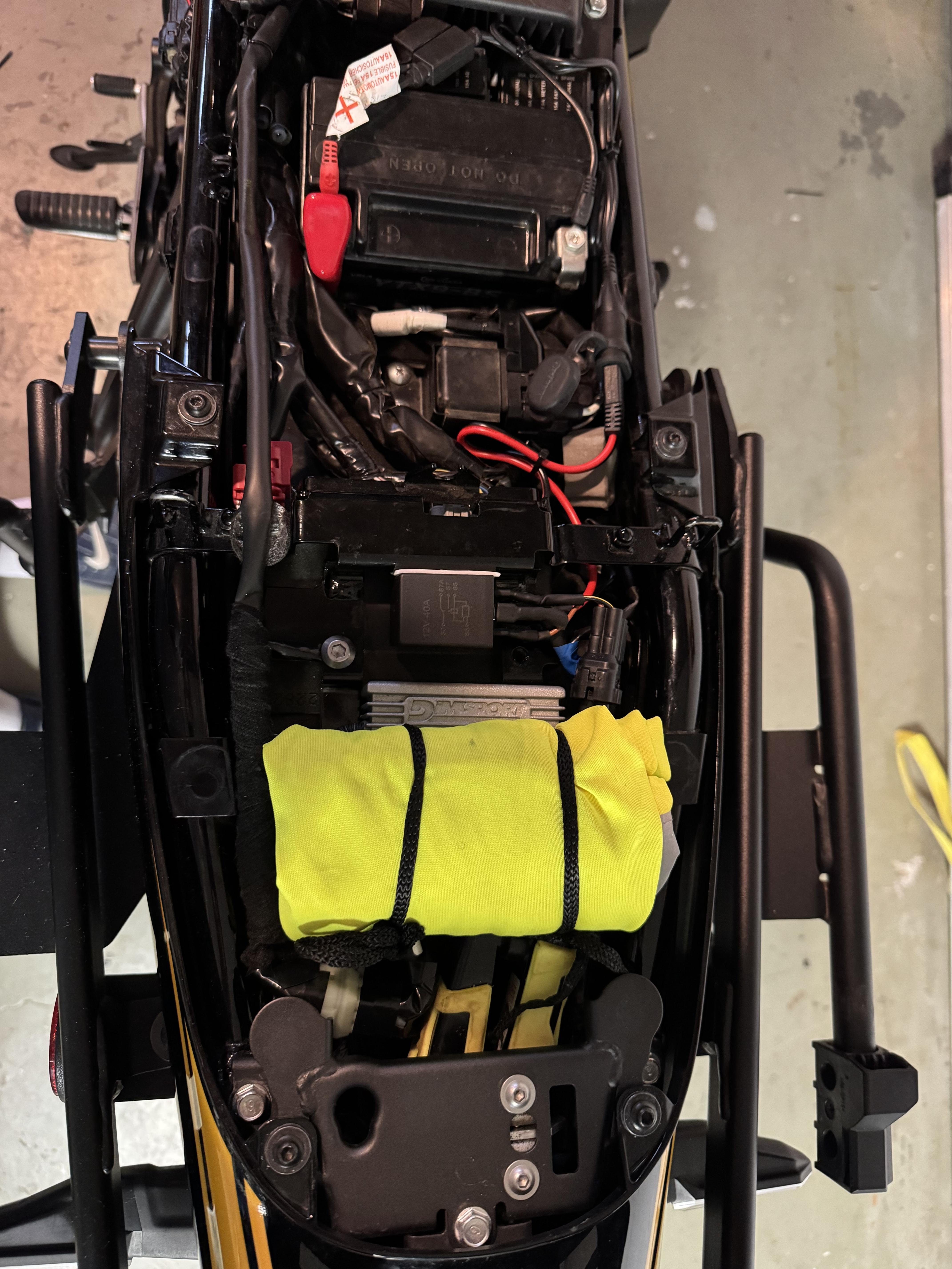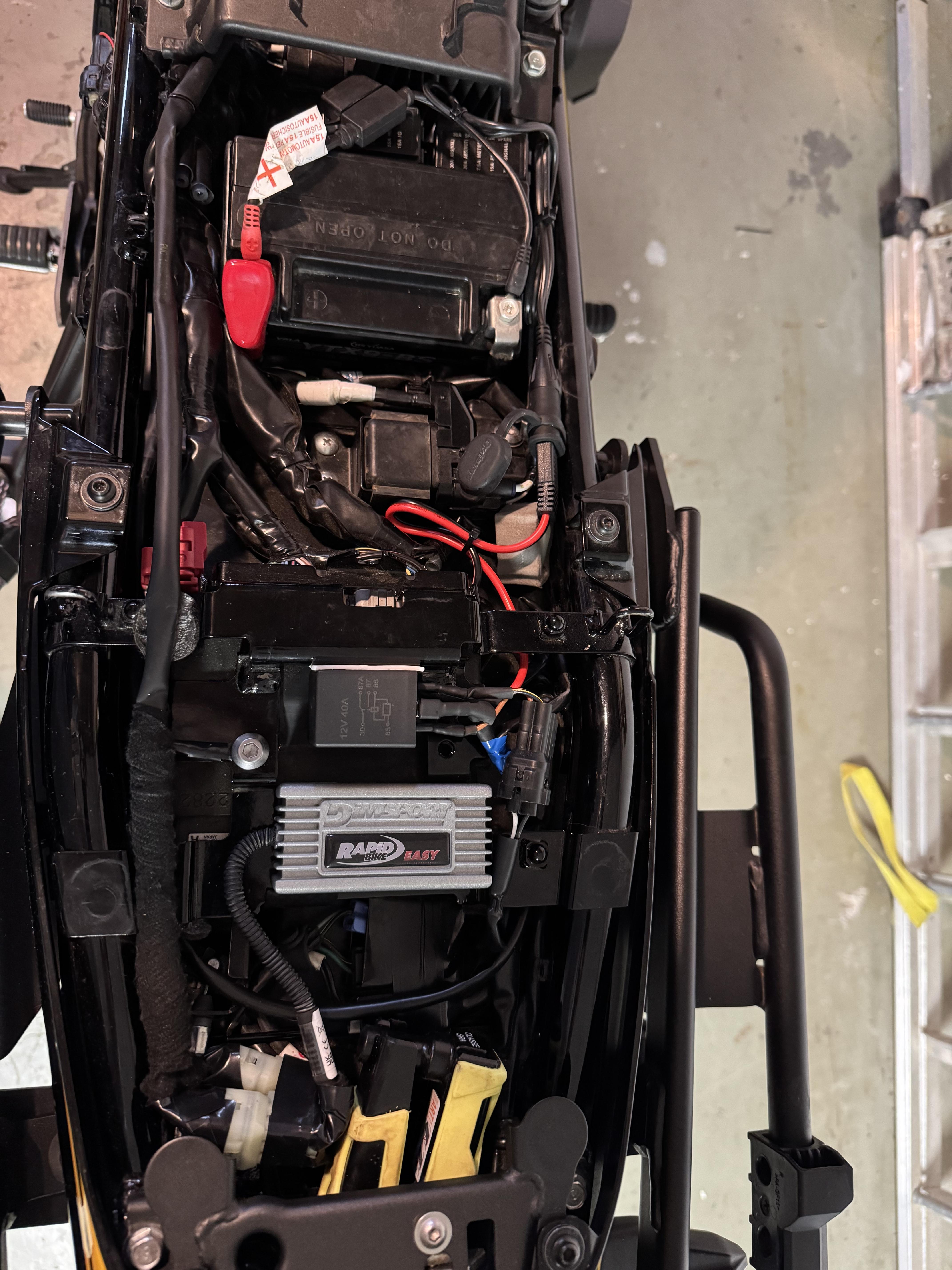 Pour l’alimentation du support du carplay, je pense me greffer aux fils sous la selle qui alimentait une prise allume cigare encombrante et inutile. L’alimentation est après contact il me semble, ce qui pourrait réparer mes étourderies, et le fusible doit être suffisant la conso du carplay étant faible.Le carplay est sensé fonctionner avec des température de -20° à 70°. C’est donc plus résistant que le téléphone ou le Tomtom pour la chaleur. Il complètement fermé, donc niveau étanchéité, cela devrait être bon. Il s’enlève très facilement du support.