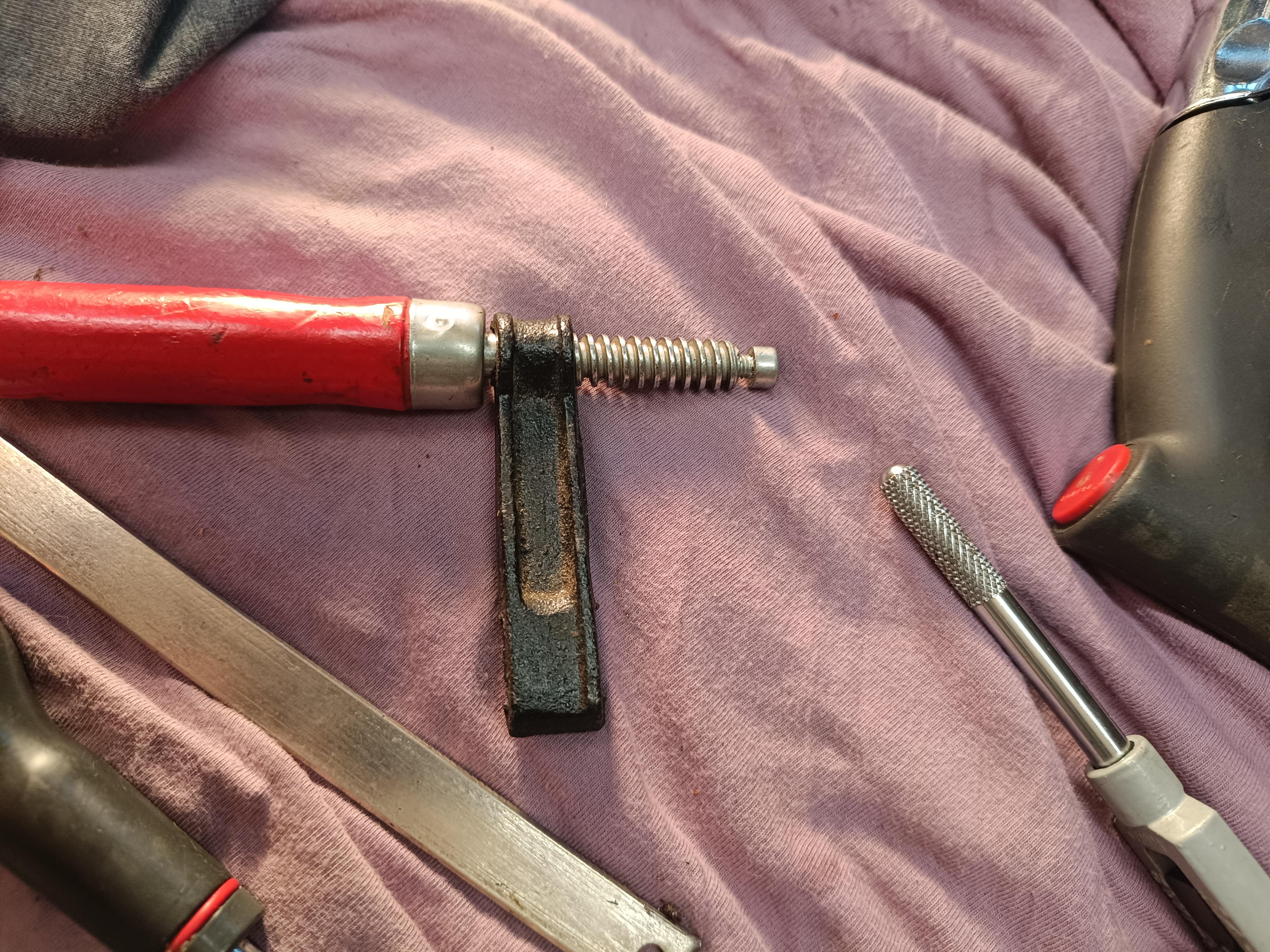 Reste le changement des joints de fourches . Tout a déjà été décrit au dessus . Je voudrais seulement vous indisuer comment faire quand on n’a pas le temps de trouver un compresseur de ressort de fourche. ( Romain l’avait oublié ) :