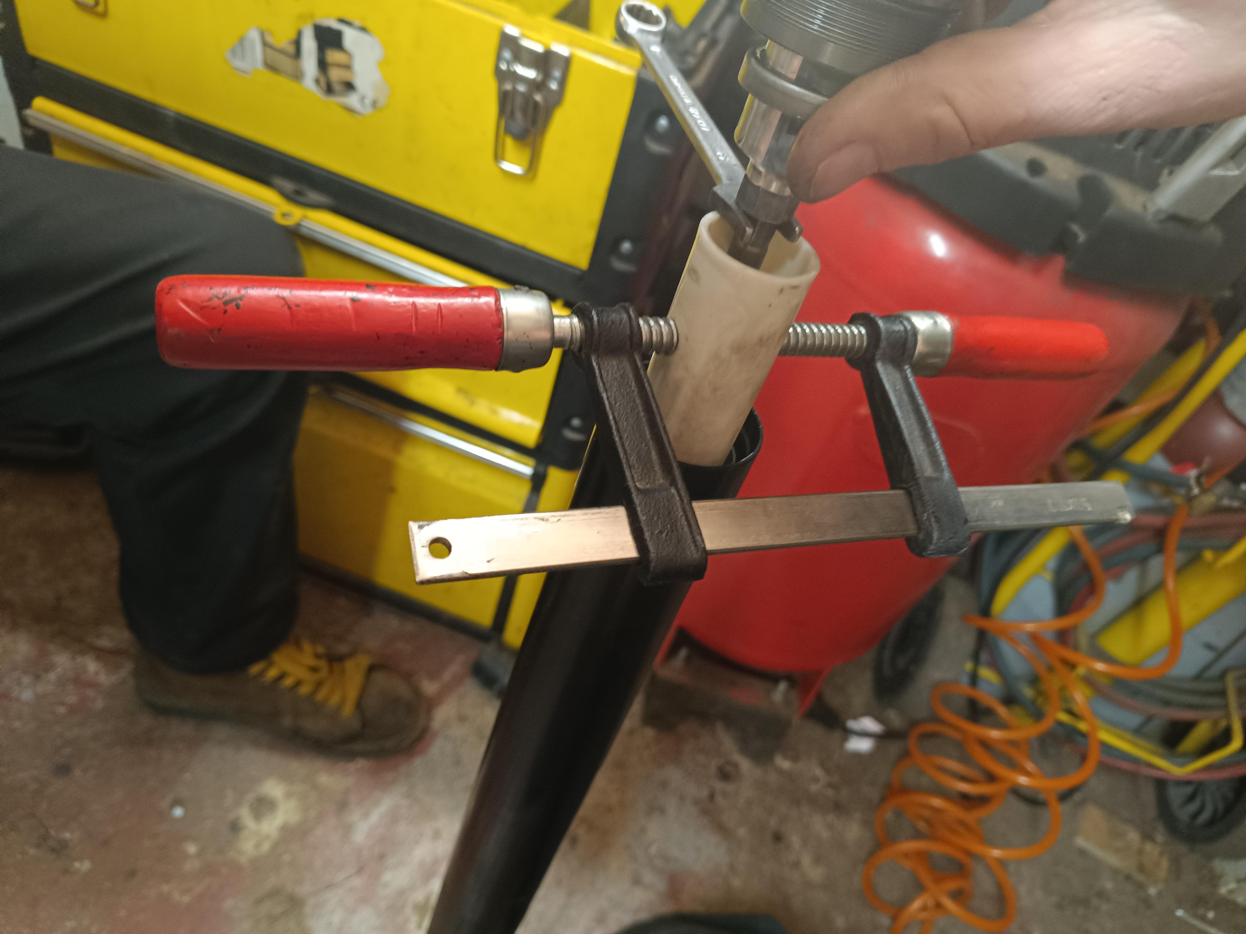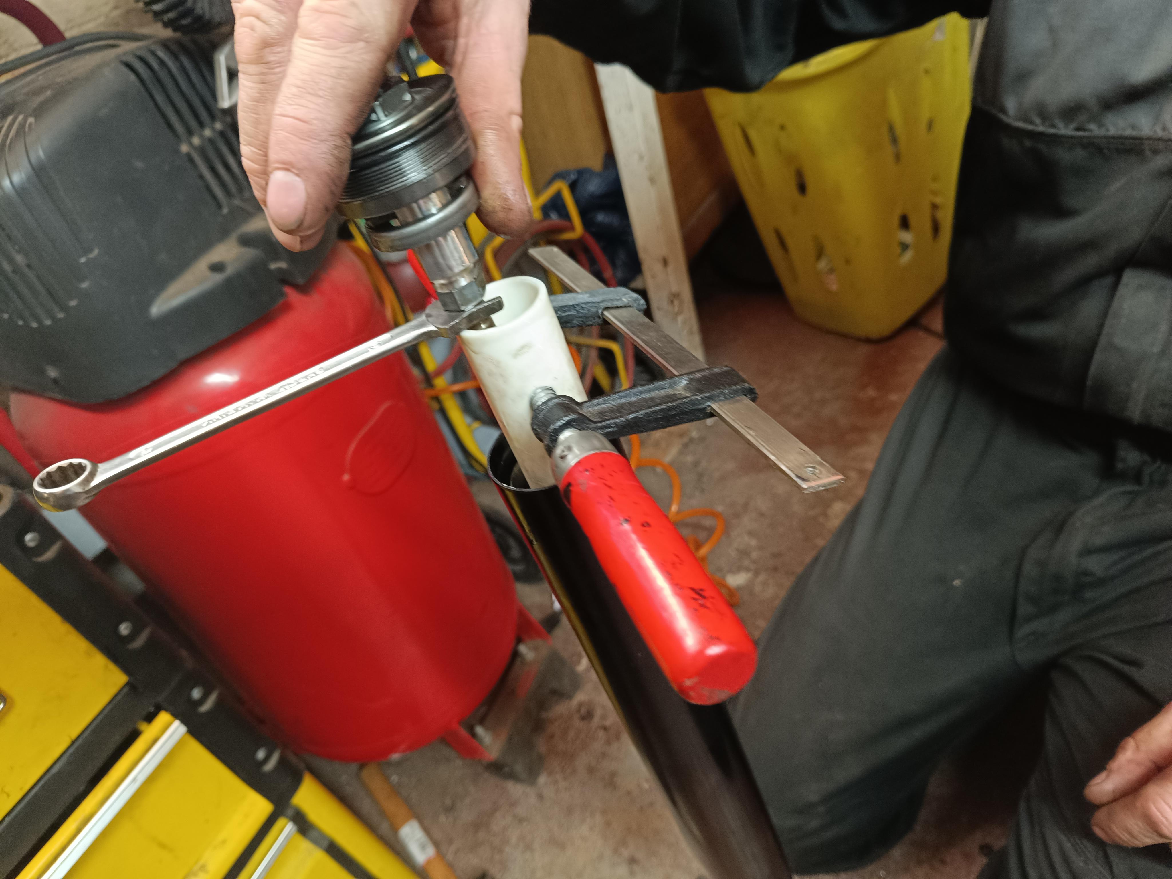 Il fait être deux : un qui pousse sur les deux manches rouges de l’outil confectionné et un qui va venir anquiller une clé de douze sous la butée du tube plongeur pour avoir accès au boulon qui permet de dévisser le chapeau du tube de fourche .